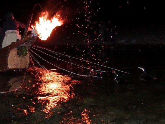 鉄製の篝(かがり)に松の割り木を燃やす篝火の照明で、鳥目?の鵜に魚がみえるようにする。